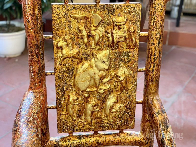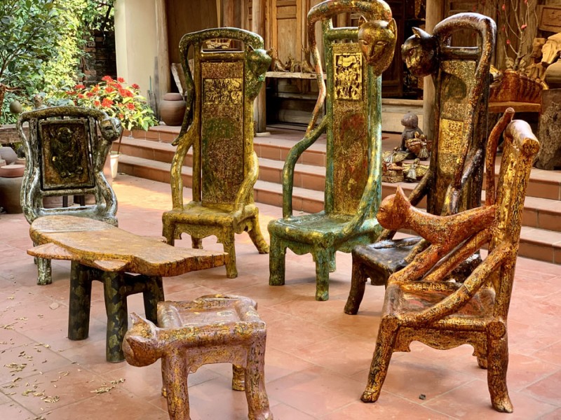 | Trên mỗi chiếc ghế, bằng đôi bàn tay tài hoa của mình, nghệ nhân đã lồng ghép hình ảnh con mèo trong tranh Đông Hồ để giúp du khách trong nước và quốc tế hiểu hơn về văn hóa dân gian Việt Nam |