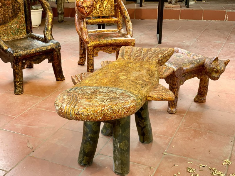 | Trong bộ sưu tập mèo trong năm 2023, nghệ nhân tâm đắc nhất là bộ bàn ghế mang tên "Bữa tiệc ngày xuân" gồm 7 chiếc ghế khắc họa 7 con mèo khác nhau, kèm theo đó là một chiếc bàn có hình tượng con cá |