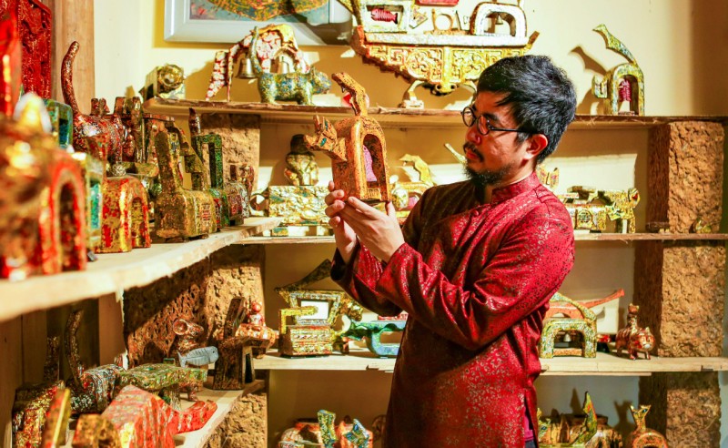 Vẫn là những chất liệu bản địa tại miền trung du Sơn Tây là gỗ mít và đá ong, kết hợp với nghệ thuật sơn mài thuần Việt, nghệ nhân Nguyễn Tấn Phát (Đường Lâm, Sơn Tây) lại một lần nữa mang lại món ăn tinh thần cho người người thưởng lãm trước thềm xuân Quý Mão 2023.