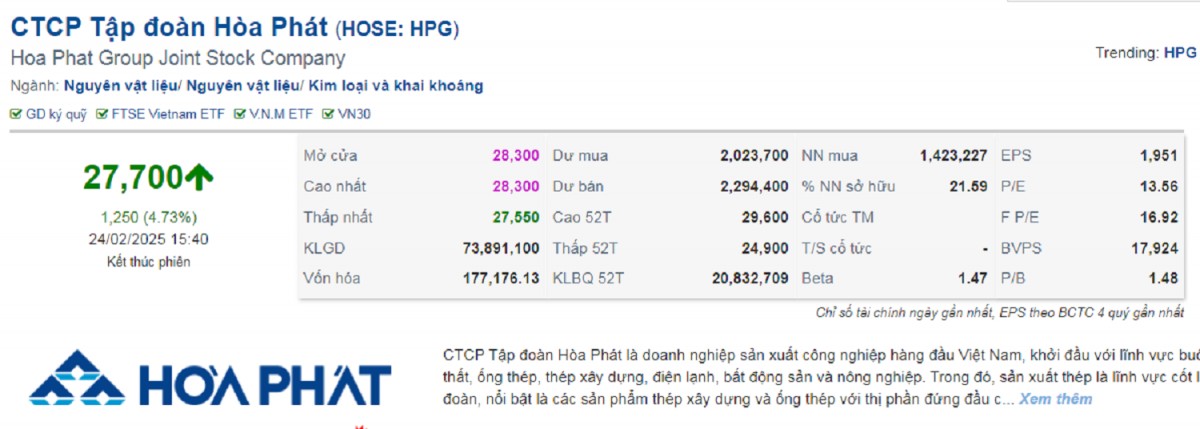 Kết thúc phiên giao dịch chiều nay ngày 24/2/2025, HPG có giá 27.700 đồng/cổ phiếu, tổng khối lượng giao dịch trong ngày gần 74 triệu cổ phiếu.