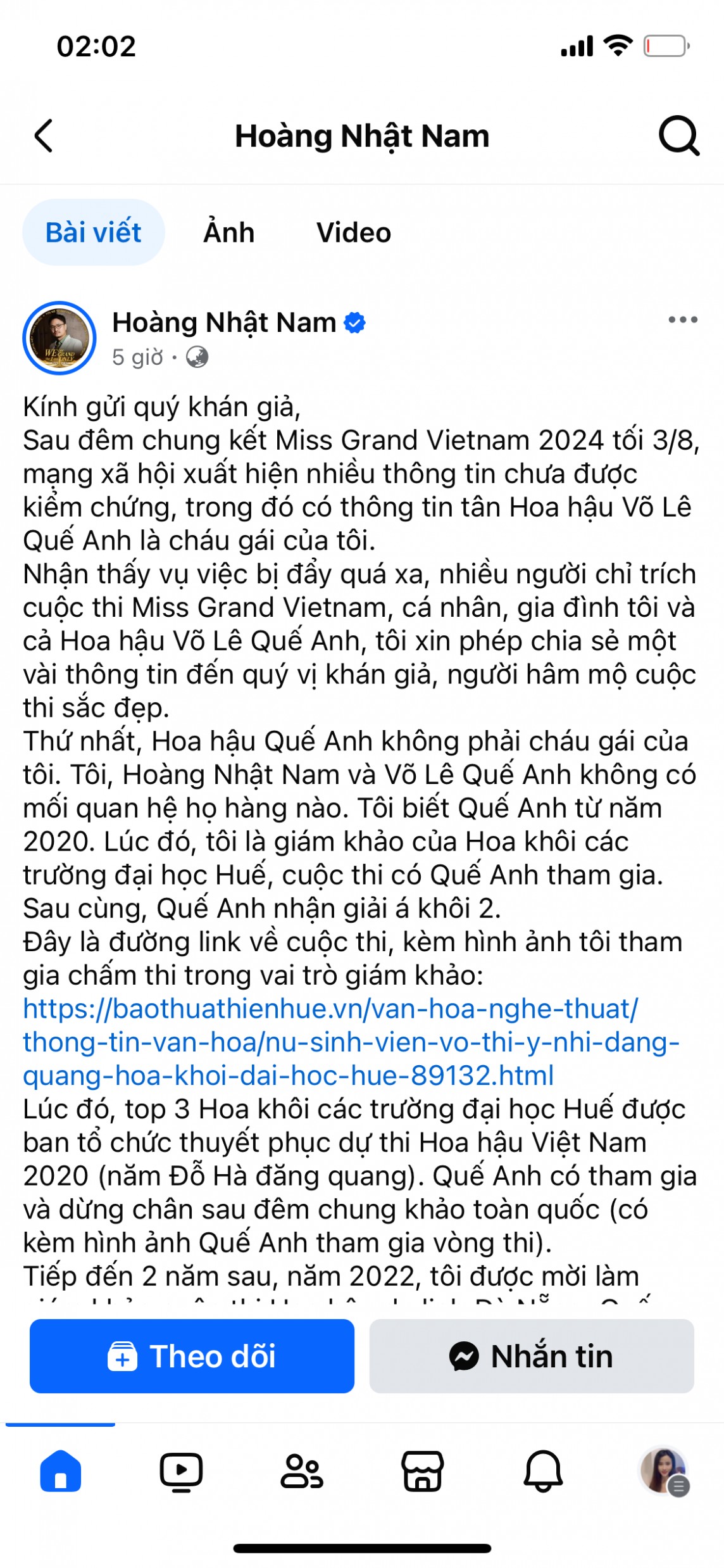 Tối 4/8, đạo diễn Hoàng Nhật Nam đã lên tiếng trên trang cá nhân của mình. Đạo diễn Miss Grand Vietnam 2024 cho biết sau đêm chung kết tối 3/8, mạng xã hội xuất hiện nhiều thông tin chưa được kiểm chứng, trong đó có thông tin tân Hoa hậu Võ Lê Quế Anh là cháu gái của anh.