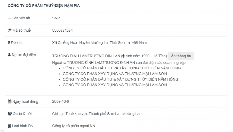 Doanh nghiệp này có người đại diện là ông Trương Đình Lam và ông Trương Đình An. Theo tìm hiểu, 2 cá nhân trên còn đồng đứng tên ở doanh nghiệp khác là Công ty Cổ phần Xây dựng và Thương mại Lam Sơn và Công ty cổ phần Thủy điện Nậm Pia, cùng có địa chỉ tại tỉnh Sơn La.