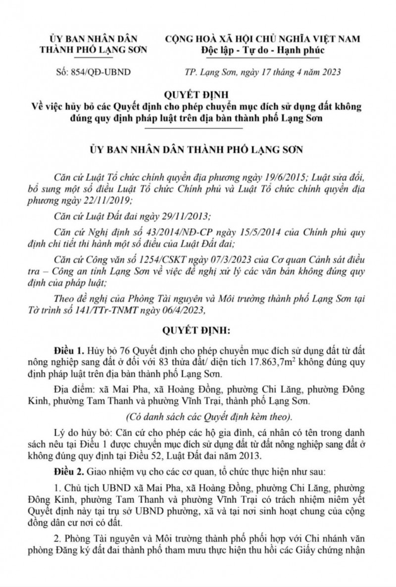 Mới đây, UBND TP Lạng Sơn (Lạng Sơn) đã ban hành Quyết định số 854/QĐ-UBND về việc hủy bỏ 76 Quyết định cho phép chuyển mục đích sử dụng đất từ đất nông nghiệp sang đất ở đối với 83 thửa đất, diện tích 17.863,7m2 không đúng quy định pháp luật trên địa bàn thành phố.