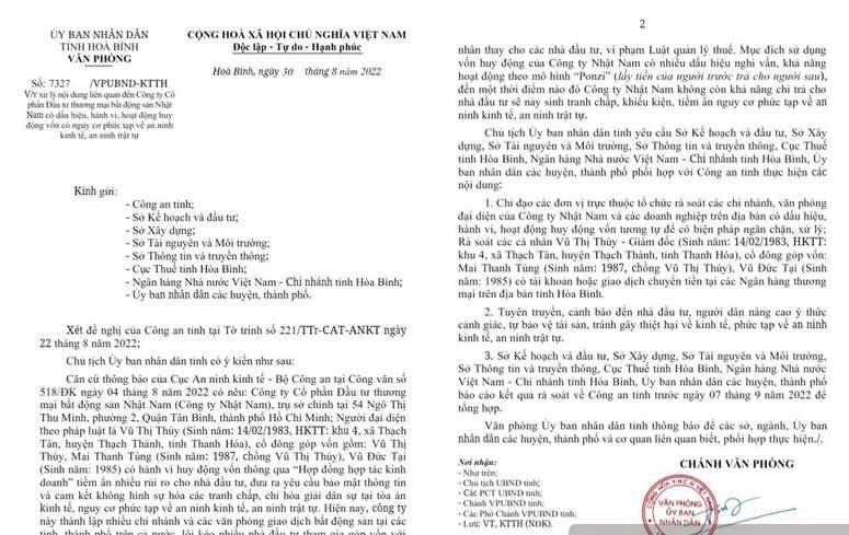 | Văn bản của UBND tỉnh Hòa Bình yêu cầu rà soát tình trạng hoạt động của Công ty Nhật Nam |