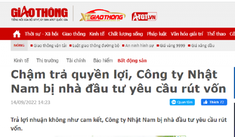 Tương tự, Báo Giao thông cũng từng phản ánh, thời gian qua có nhiều thông tin, Công ty Nhật Nam trả lợi nhuận không như cam kết, bị nhà đầu tư yêu cầu rút vốn. Theo thông tin Báo Giao thông đưa tin, nhận được phản ánh của nhà đầu tư đã góp vốn với Nhật Nam về việc đang yêu cầu đơn vị này chấm dứt hợp đồng, hoàn trả vốn.