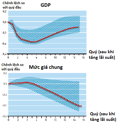 Hình trên cho thấy một “xung lực” dưới dạng NHTW tăng lãi suất tác động tới các biến số vĩ mô như thế nào qua thời gian. Đồ thị trên dựa trên phân tích dữ liệu thời hậu chiến ở Mỹ (Christiano, Eichenbaum và Evans, 1999), trong đó các cú sốc được nhận diện dựa trên phương pháp của Sims.