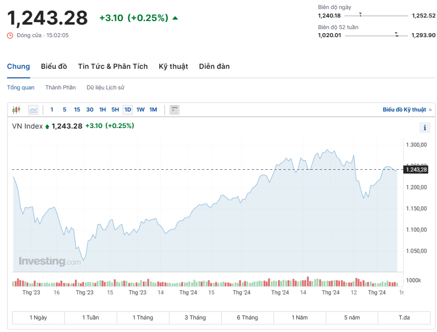 Trong phiên giao dịch hôm nay, tâm lý thận trọng bao trùm thị trường khiến chỉ số VN-Index diễn biến lình xình và đóng cửa tại mốc 1.243,28 điểm, tăng 3,1 điểm, tương đương 0,25%.