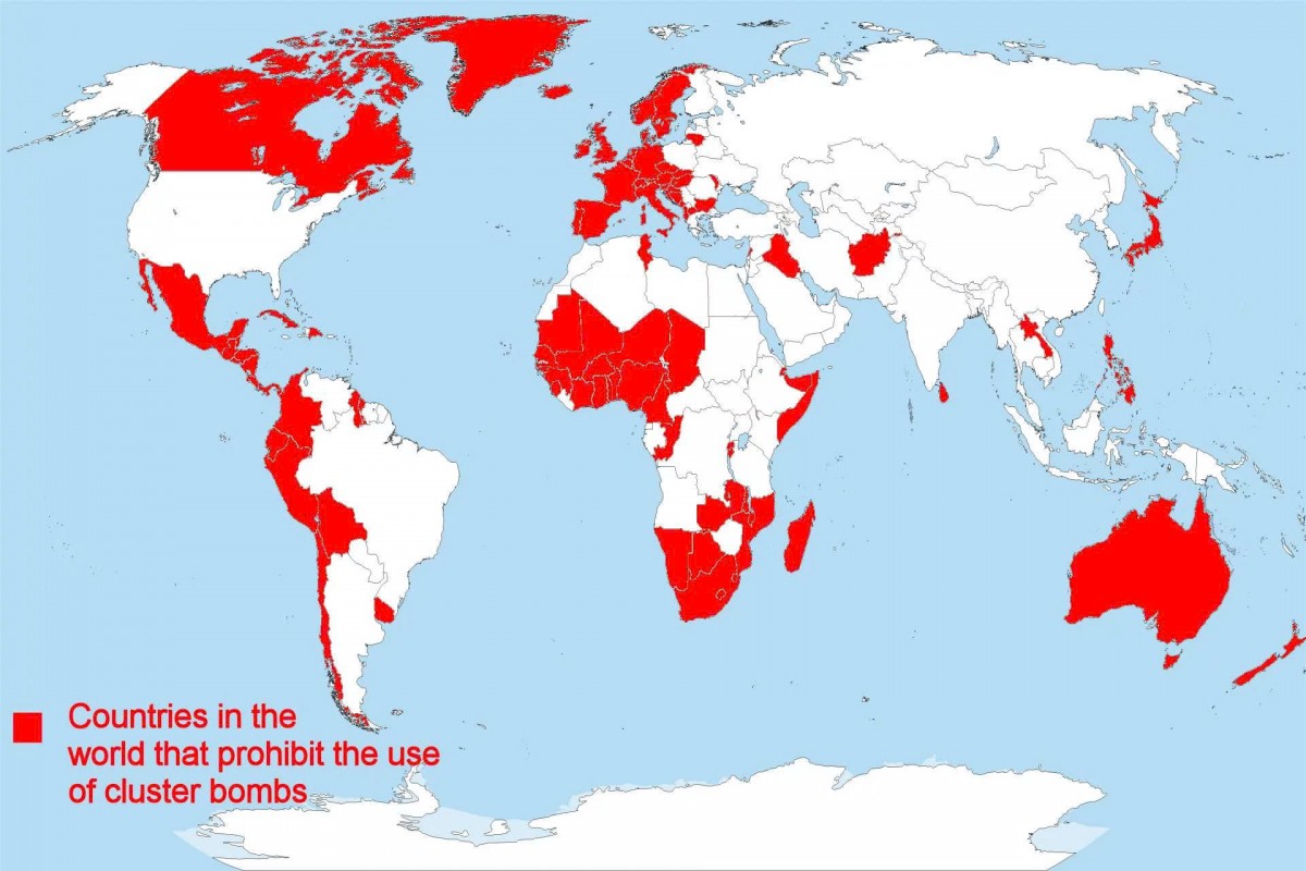 | Bản đồ các quốc gia cấm sử dụng bom chùm. Nguồn ảnh: Army Recognition |