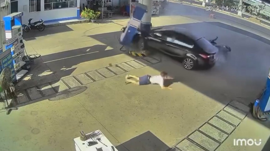 Sau khi đổ xăng xong, chiếc xe bỗng lùi lại với tốc độ nhanh, rồi lao lên phía trước, quay một vòng và húc văng 2 khách hàng đang chờ đổ xăng. Tiếp đó, chiếc xe tông đổ trụ bơm xăng.