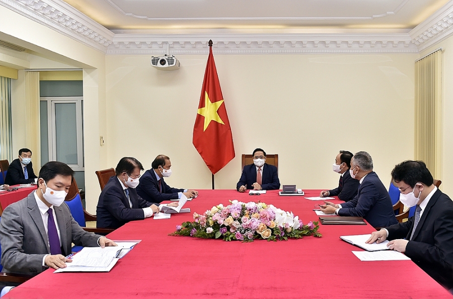 Bày tỏ cảm ơn Australia đã cam kết viện trợ cho Việt Nam 40 triệu AUD để tiếp cận vaccine Covid-19, Thủ tướng Phạm Minh Chính khẳng định sẽ hợp tác chặt chẽ với Australia để triển khai hiệu quả khoản viện trợ này, đồng thời đề nghị Australia ưu tiên cho Việt Nam tiếp cận trong thời gian sớm nhất nguồn vaccine AstraZeneca sản xuất tại Australia.