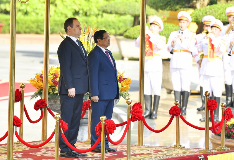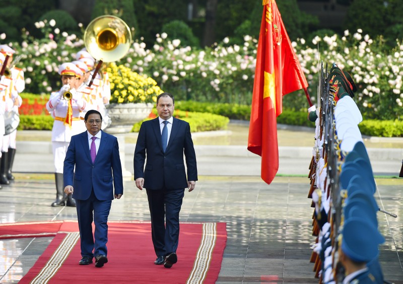 Thủ tướng Phạm Minh Chính chủ trì lễ đón chính thức Thủ tướng Cộng hòa Belarus Roman Golovchenko và Đoàn đại biểu Chính phủ Cộng hòa Belarus. Ảnh: Tuấn Huy |