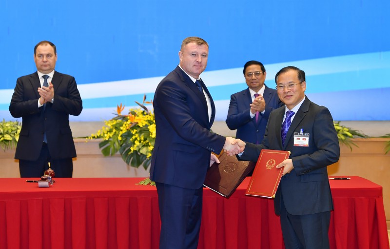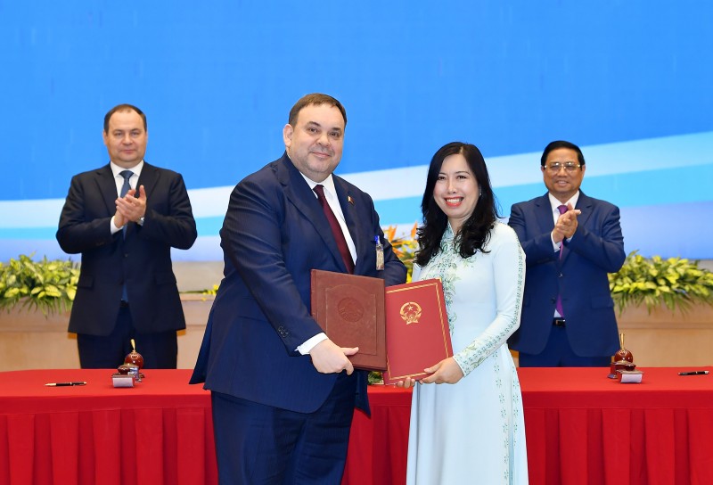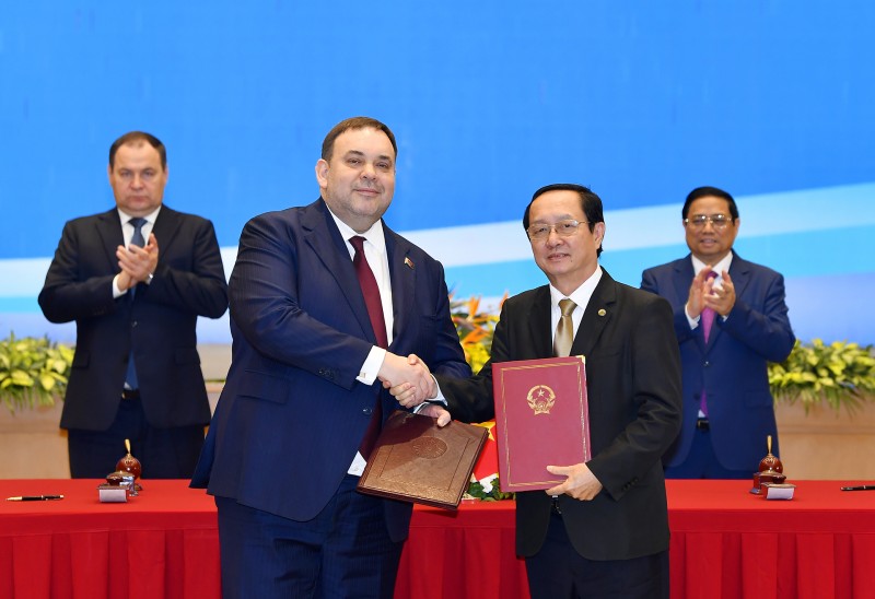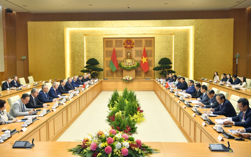 Song song đó, hai Thủ tướng đánh giá cao những tiến triển tích cực trong hợp tác kinh tế, thương mại và đầu tư thời gian qua, trong đó có việc triển khai Hiệp định thương mại tự do giữa Việt Nam và Liên minh Kinh tế Á - Âu (EAEU), mà Belarus là thành viên; khẳng định hai nước cần khai thác hơn nữa dư địa và tiềm năng hợp tác song phương.