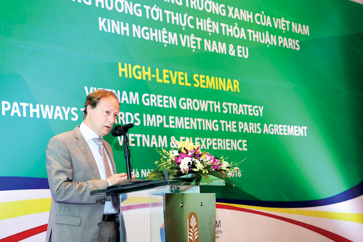 | Đại sứ, Trưởng Phái đoàn Liên minh châu Âu tại Việt Nam - Bruno Angelet phát biểu tại hội thảo Chiến lược quốc gia về tăng trưởng xanh của Việt Nam |