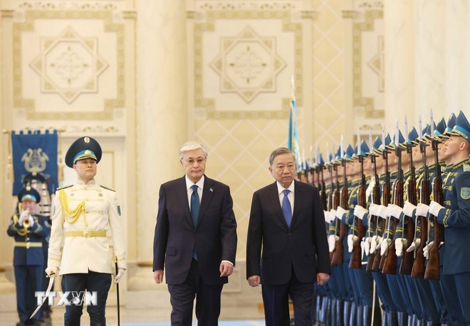 | Tổng Bí thư Tô Lâm và Tổng thống Kassym-Jomart Tokayev duyệt đội danh dự. Ảnh: TTXVN |
