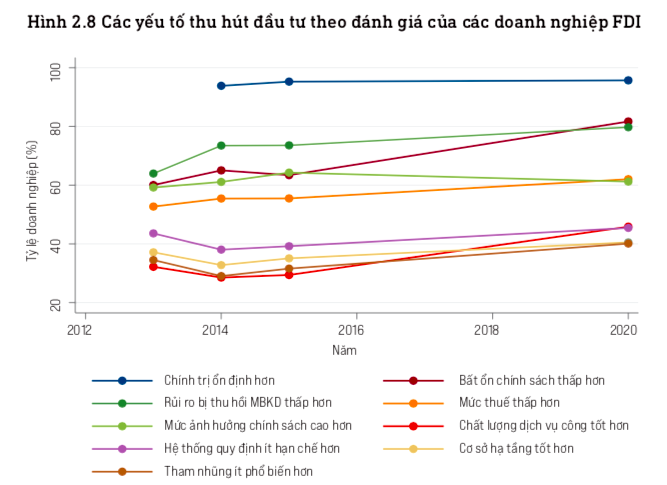 Tỉ lệ doanh nghiệp FDI nhận định rủi ro bị thu hồi mặt bằng là thấp tại Việt Nam đã tăng từ 64% lên 80%. Tỉ lệ doanh nghiệp FDI cho rằng Việt Nam có rủi ro bất ổn chính sách thấp hơn cũng tăng từ 60% năm 2013 lên 82% năm 2020.