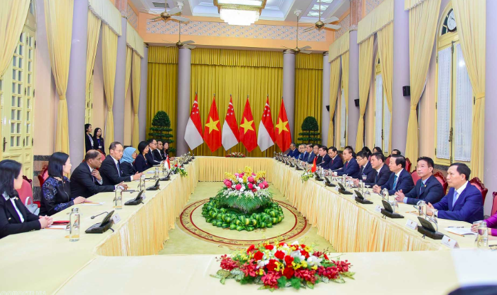 Chủ tịch nước Nguyễn Xuân Phúc và Tổng thống Halimah Yacob nhấn mạnh quan hệ hợp tác giữa hai nước đang phát triển mạnh mẽ, năng động nhất là về hợp tác kinh tế. Bất chấp dịch bệnh Covid-19, kim ngạch thương mại hai chiều tăng trưởng mạnh mẽ, đạt trên 8 tỷ USD trong năm ngoái, tăng trên 23% so với năm 2020.