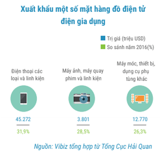 Trong năm 2017, tổng kim ngạch xuất khẩu nhóm hàng đồ điện tử, đồ điện gia dụng chiếm 28,9% kim ngạch xuất khẩu cả nước. Cụ thể, kim ngạch xuất khẩu nhóm mặt hàng này (điện thoại di động và linh kiện, máy ảnh máy quay phim và linh kiện, máy móc thiết bị dụng cụ phụ tùng khác) đạt 61,8 tỷ USD, tăng 14,45 tỷ USD, bằng 130% năm 2016.