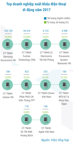 Trong năm 2017, Việt Nam đã xuất khẩu điện thoại các loại và linh kiện đạt 45,27 tỷ USD, tăng 31,9% so với năm 2016. Trong đó, xuất khẩu điện thoại di động đạt 184,4 triệu chiếc và chủ yếu sang các thị trường như Nga, Đức, Áo, Indonesia, Mỹ, Ả rập…