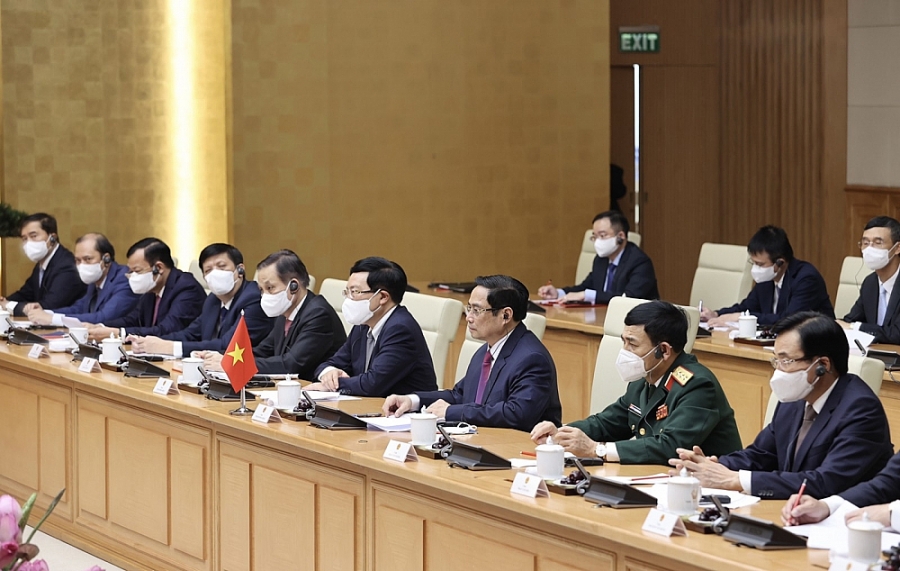 Tại buổi hội kiến, hai đồng chí lãnh đạo trao đổi tình tình và đánh giá cao các biện pháp ứng phó với dịch Covid-19 tại mỗi nước thời gian qua. Thủ tướng Phạm Minh Chính bày tỏ cảm kích Đảng, Nhà nước và nhân dân Lào mặc dù còn gặp nhiều khó khăn đã trao tặng 300 nghìn USD để hỗ trợ Việt Nam phòng chống dịch, thể hiện tình cảm đồng chí, anh em gắn bó và truyền thống tương thân tương ái giữa hai dân tộc Việt - Lào.