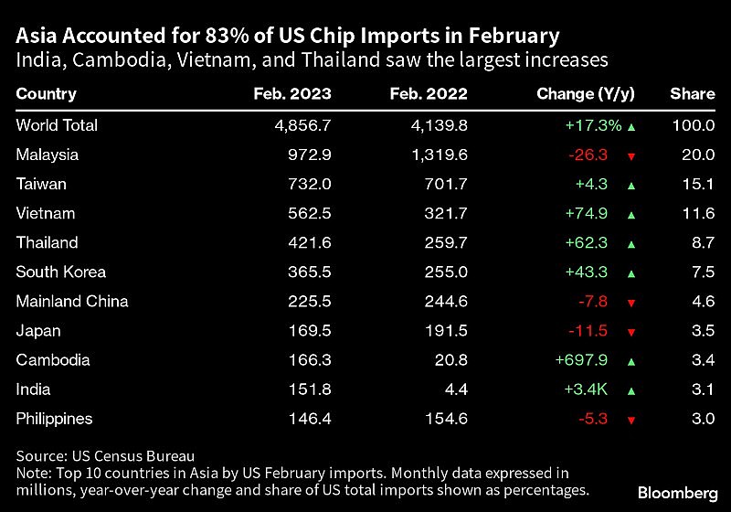 Nhập khẩu chip của Mỹ đã tăng 17% so với năm ngoái lên 4,86 tỷ USD trong tháng 2, theo dữ liệu của Tổng cục Thống kê Mỹ, với châu Á chiếm 83% trong tổng số đó. Trong đó, xuất khẩu chất bán dẫn của Ấn Độ vào Mỹ tăng 34 lần lên 152 triệu USD, trong khi Campuchia đạt mức tăng trưởng ấn tượng 698%, chỉ kém Nhật Bản ở mức 166 triệu USD, con số chưa từng có trong những năm trước đây.