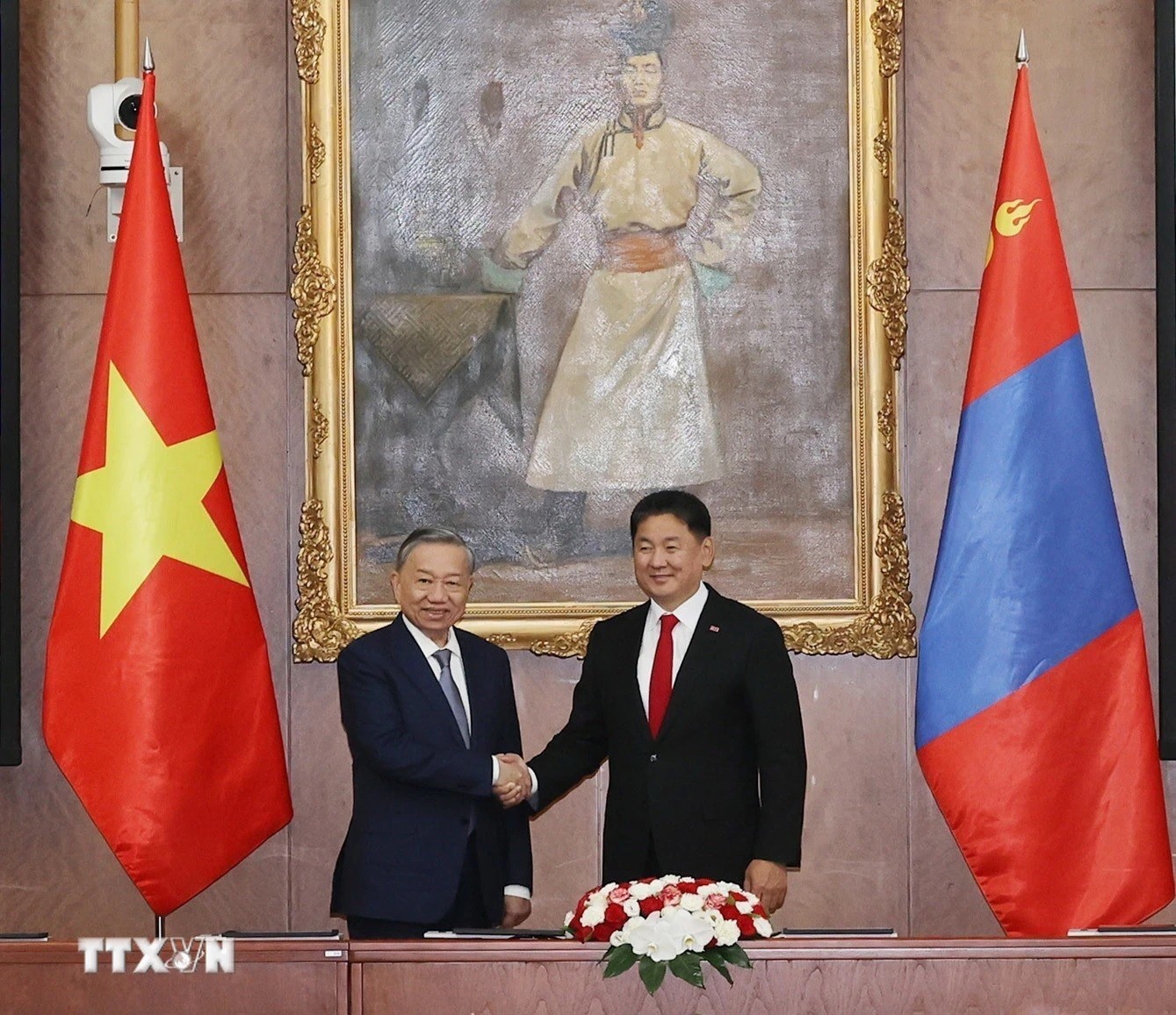 Kết thúc hội đàm, Tổng Bí thư, Chủ tịch nước Tô Lâm và Tổng thống Mông Cổ đã ra Tuyên bố chung Việt Nam - Mông Cổ về thiết lập quan hệ Đối tác Toàn diện nhằm định hướng cho sự hợp tác tin cậy sâu sắc giữa hai nước trên tất cả các lĩnh vực ngày càng đi vào chiều sâu, thực chất, hiệu quả và toàn diện.