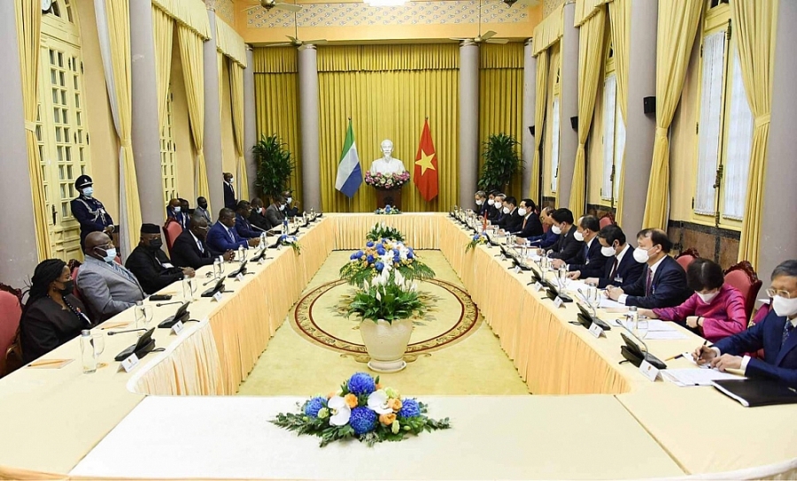 Chiều ngày 15/3/2022, tại Phủ Chủ tịch, Chủ tịch nước Nguyễn Xuân Phúc và Phu nhân đã chủ trì lễ đón Tổng thống Sierra Leone cùng Phu nhân và đoàn đại biểu cấp cao Sierra Leone thăm chính thức Việt Nam từ ngày 14-20/3/2022. Chuyến thăm chính thức Việt Nam của Tổng thống Sierra Leone đã thể hiện sự coi trọng và mong muốn của Lãnh đạo Sierra Leone tăng cường hơn nữa quan hệ hợp tác hữu nghị giữa hai nước. Đặc biệt chuyến thăm diễn ra vào những ngày đầu năm 2022 và trong bối cảnh hai nước kỷ niệm 40 năm thiết lập quan hệ ngoại giao (1982-2022).