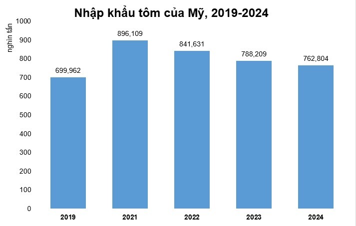 | Năm 2024, Hoa Kỳ nhập khẩu 762,804 tấn tôm, giảm 3% so với năm 2023 và giảm 15% so với mức đỉnh của năm 2021. Tuy nhiên, con số này vẫn cao hơn 9% so với năm 2019. |