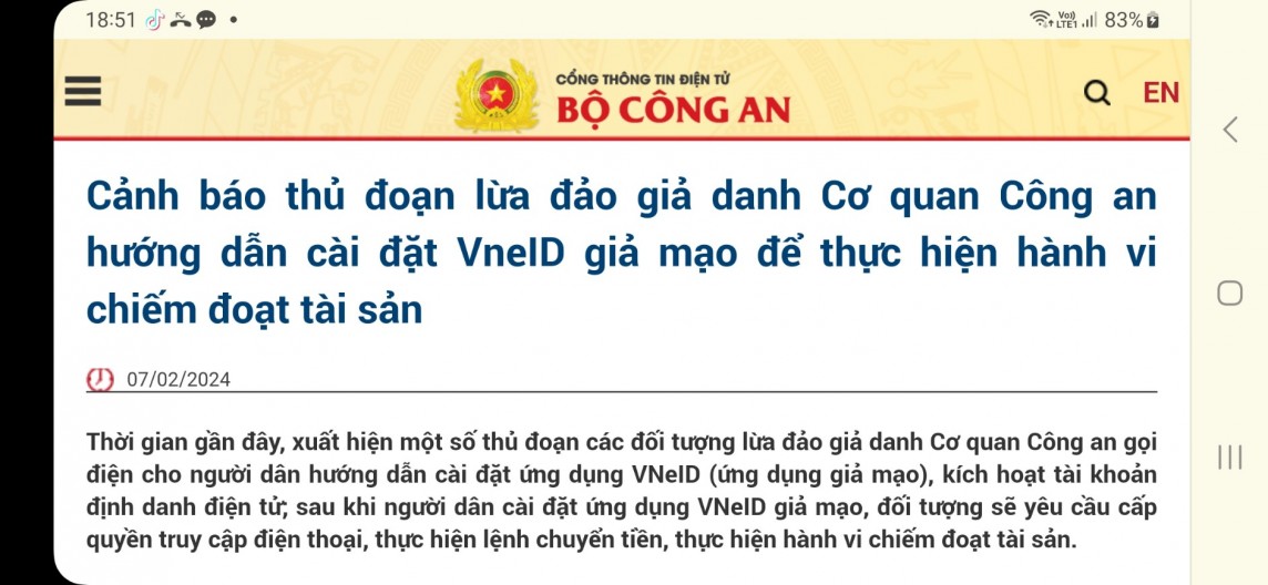 Tuy nhiên, thời gian gần đây, xuất hiện thủ đoạn các đối tượng lừa đảo, gọi điện thoại rồi dùng ứng dụng giả mạo có giao diện giống với ứng dụng VNeID thật, kích hoạt tài khoản định danh điện tử, cập nhật thông tin cá nhân trên tài khoản định danh điện tử. Sau khi người dân cài đặt, ứng dụng VNeID giả mạo được cấp quyền truy cập thiết bị ở mức cao. Từ đó, các đối tượng lừa đảo kiểm soát được ứng dụng tài khoản ngân hàng trên điện thoại của người dân. Tiếp đó, bọn chúng thực hiện lệnh chuyển tiền để chiếm đoạt tài sản.