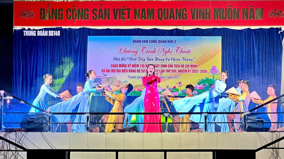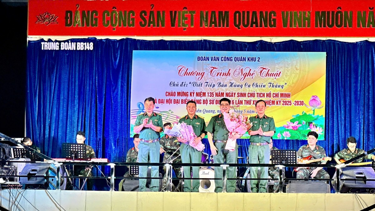 Hướng tới chào mừng Đại hội đại biểu Đảng bộ Sư đoàn 316 lần thứ XVII, nhiệm kỳ 2025 - 2030, tối 12 - 13/5, tại Trung đoàn 98 và Trung đoàn 148, Sư đoàn 316; Đoàn Văn công Quân khu 2 đã tổ chức hai đêm diễn nghệ thuật phục vụ cán bộ, chiến sĩ Sư đoàn với chủ đề “Viết tiếp Bản hùng ca chiến thắng”. Đây không chỉ là món quà tinh thần giàu ý nghĩa, mà còn là điểm nhấn quan trọng trong chuỗi hoạt động chào mừng sự kiện trọng đại của Đảng bộ Sư đoàn.