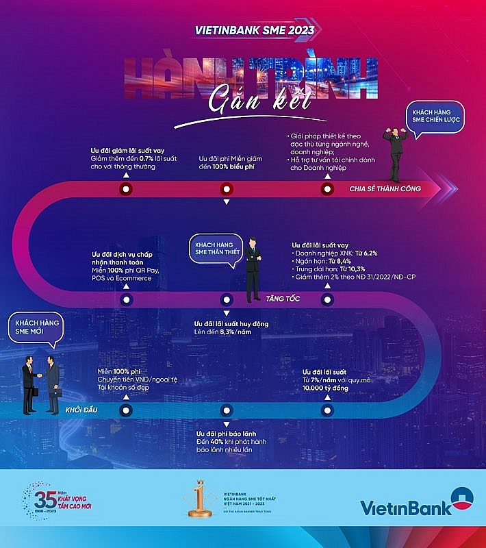 Nhân dịp này, VietinBank “tung” combo tài chính trọn gói “Hành trình gắn kết”, theo sát sự phát triển của doanh nghiệp vừa và nhỏ (SME) trong hành trình đồng hành cùng VietinBank. Cùng tìm hiểu combo tài chính trọn gói này qua infographic dưới đây.
