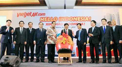 | Ông Phạm Bình Minh- Phó Thủ tướng Chính phủ, Bộ trưởng Bộ Ngoại giao (thứ ba bên phải), ông Budi Karya Sumadi- Bộ trưởng Giao thông Vận tải Indonesia cùng các lãnh đạo cấp cao của Việt Nam, Indonesia và đại diện lãnh đạo Vietjet thực hiện nghi thức công bố đường bay |