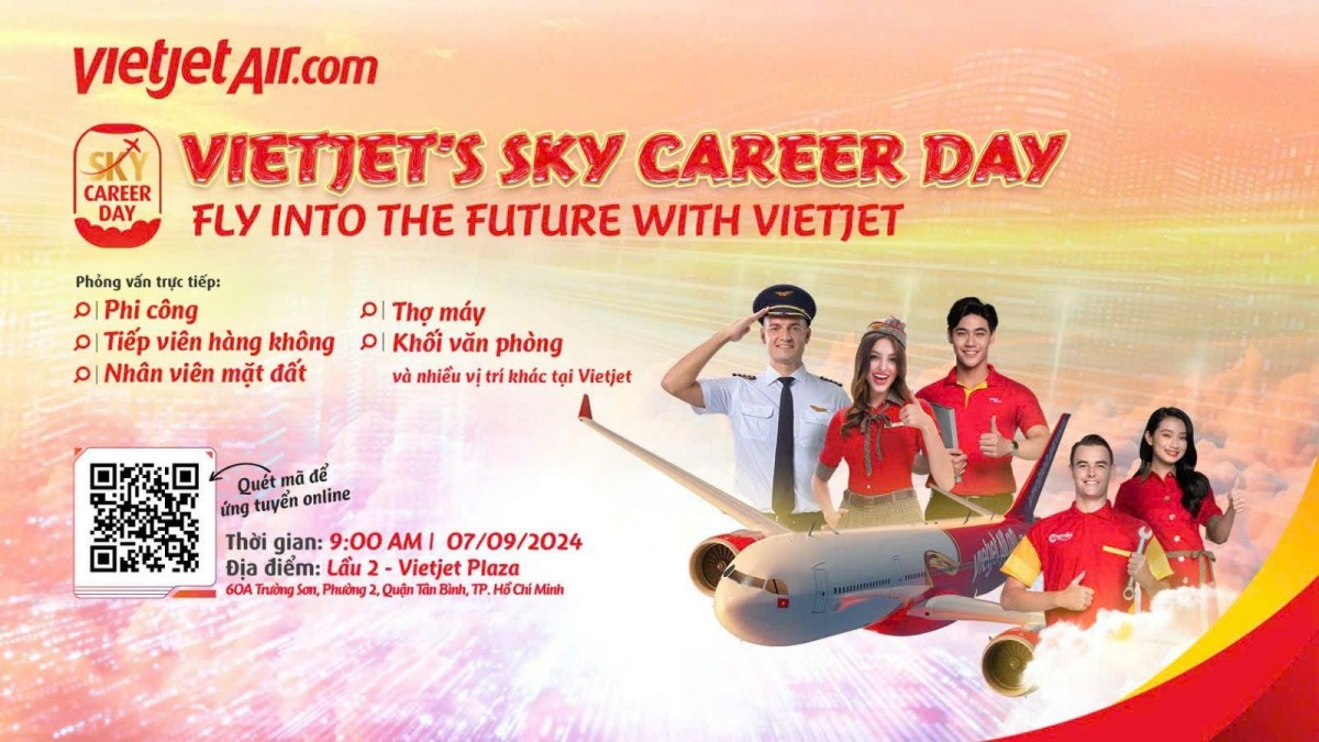 Ngày hội tuyển dụng - Vietjet Sky Career Day diễn ra ngày 7/9 tại Vietjet Plaza - 60A Trường Sơn, phường 2, quận Tân Bình, TP.HCM. Sự kiện dự kiến thu hút gần 1.000 ứng viên tiềm năng đến từ Việt Nam và các nước, ngày hội tuyển dụng cũng có sự tham gia của các phi công, tiếp viên hàng không như Cơ phó Võ Hồng Hạnh, Cơ phó Bùi Thanh Hà (Hacoi), Tiếp viên trưởng Hoàng Minh Quý,…