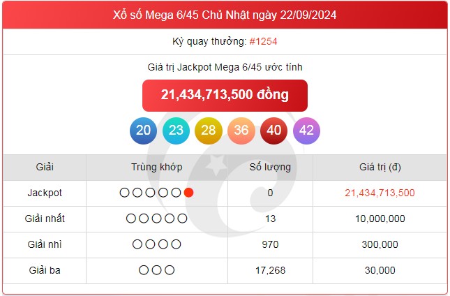 | Vietlott 22/9, kết quả xổ số Vietlott hôm nay 22/9/2024, Vietlott Mega 6/45 22/9 |