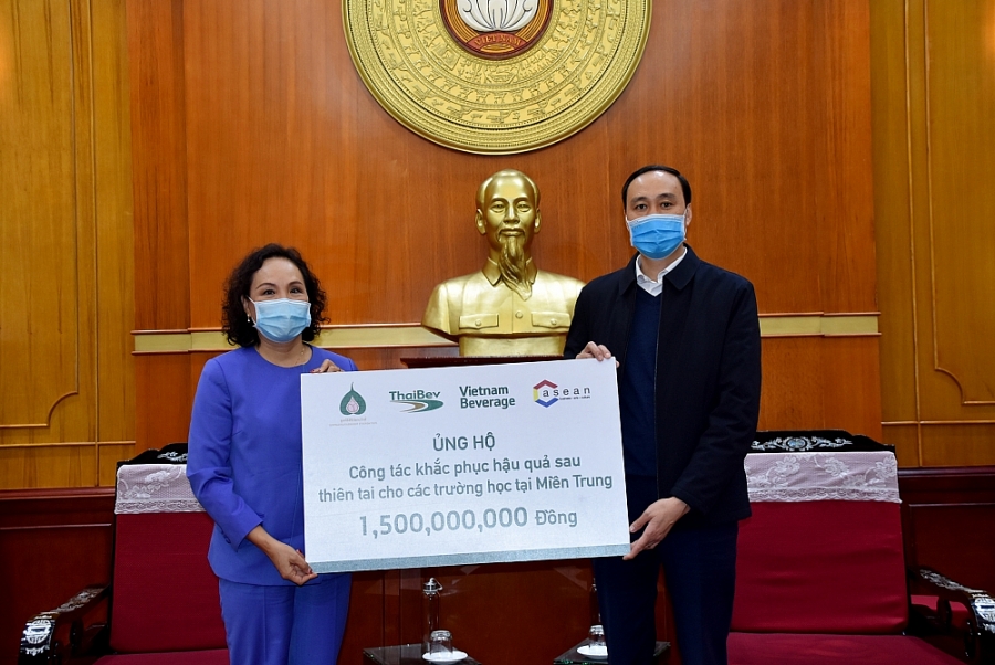 Phát biểu tại lễ trao tặng, bà Trần Kim Nga - Tổng Giám Đốc Vietnam Beverage cho biết: ”Phát triển bền vững với cam kết thực hiện trách nhiệm xã hội là một trong những tiêu chí hoạt động của chúng tôi. Trong đó, giáo dục là ưu tiên hàng đầu trong các hoạt động vì cộng đồng của Vietnam Beverage. Trước tình trạng bão lũ tại các tỉnh miền Trung vừa qua đã gây thiệt hại nặng nề cho ngành giáo dục, nhiều trường học ngập sâu hư hỏng nặng, thiết bị dạy học bị cuốn trôi…chúng tôi rất vui mừng được sự đồng hành của Ủy Ban Trung Ương Mặt Trận Tổ quốc Việt Nam để có thể chung tay, góp một phần vào hành trình khôi phục lại con đường đến trường của học sinh các tỉnh miền Trung.
