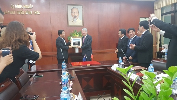 | Minister of Agriculture and Rural Development Nguyen Xuan Cuong presents a souvenir to NZ Minister of Agriculture, Biosecurity, Food Safety, and Rural Communities Damien O’Connor - Photo: mard.gov.vn |