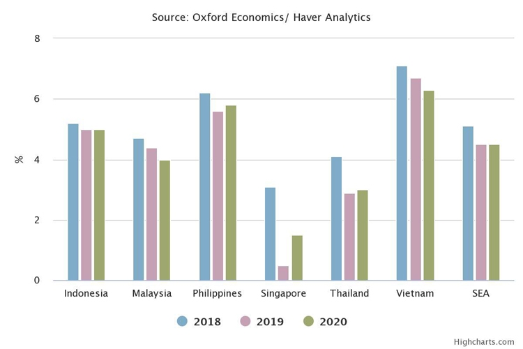Sian Fenner, ICAEW Economic Advisor and Oxford Economics Lead Asia Economist said, Amid ongoing global headwinds and uncertainty around the outcome of US-China trade talks, we expect to see a further deterioration in economic prospects across the region, particularly amongst more trade dependent economies. Overall, regional South-East Asia GDP growth is expected to moderate to 4.5% this year, and stabilise at the same rate in 2020.”