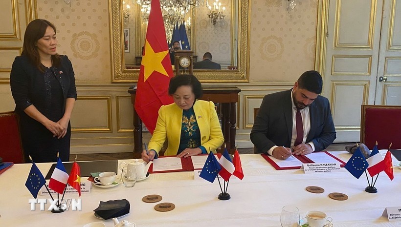 Bộ trưởng Phạm Thị Thanh Trà và Bộ trưởng Công vụ, Đơn giản hóa và Chuyển đổi dịch vụ công Pháp Guillaume Kasbarian ký Thỏa thuận hợp tác trong lĩnh vực công vụ và hiện đại hóa nền hành chính giai đoạn 2022-2024. (Ảnh: TTXVN) |