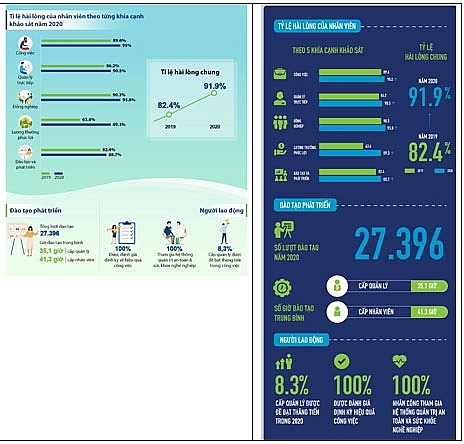 Không chỉ là thương hiệu được người lao động mong muốn “đầu quân”, Vinamilk cũng đã nhận được sự đánh giá rất tích cực ngay chính từ đội ngũ nhân viên của công ty. Theo kết quả khảo sát nội bộ năm 2020 trên 5 khía cạnh trọng yếu là công việc, quản lý trực tiếp, đồng nghiệp, lương thưởng – phúc lợi, đào tạo và phát triển, chỉ số hài lòng của người lao động tại Vinamilk đạt 91,9%. Đây là mức tăng cao nhất trong những năm công ty tiến hành khảo sát này.