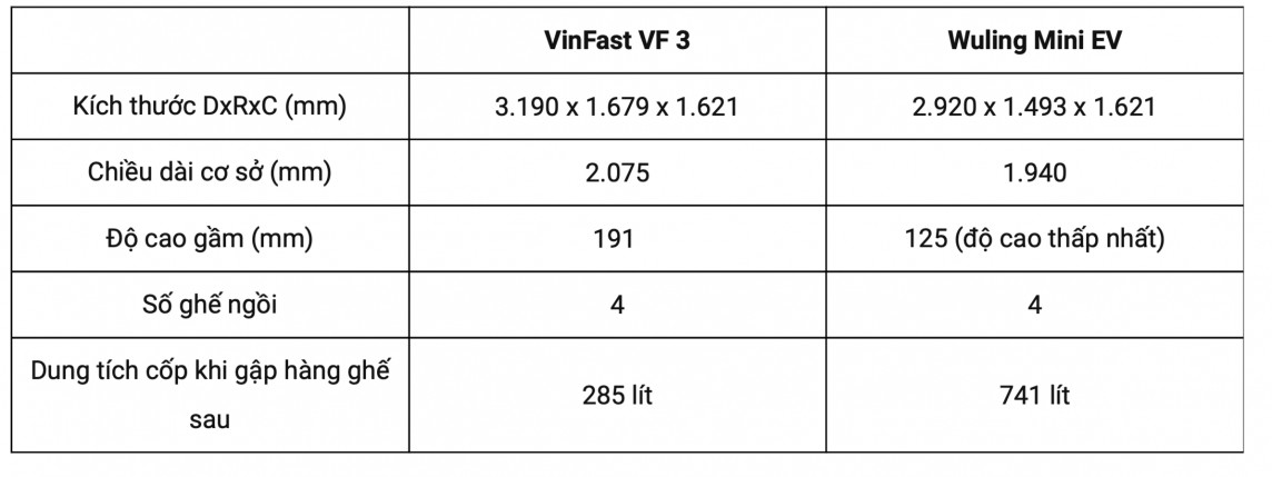 Về kích thước, VinFast VF 3 thể hiện sự vượt trội so với đối thủ có nguồn gốc Trung Quốc với chiều dài hơn 270 mm và chiều rộng hơn 186 mm. Với thiết kế gầm cao, VF 3 có khoảng sáng gầm lớn, cao hơn nhiều mẫu xe gầm cao phổ thông như Hyundai Santa Fe (185 mm). Điều này giúp xe vượt qua những cung đường gồ ghề ở nước ta. Bên cạnh đó, chiều cao tổng thể của hai xe tương đương nhau. Wuling Mini EV cung cấp dung tích cốp ấn tượng với 741 lít khi gập hàng ghế sau, còn VF 3 đạt 285 lít.