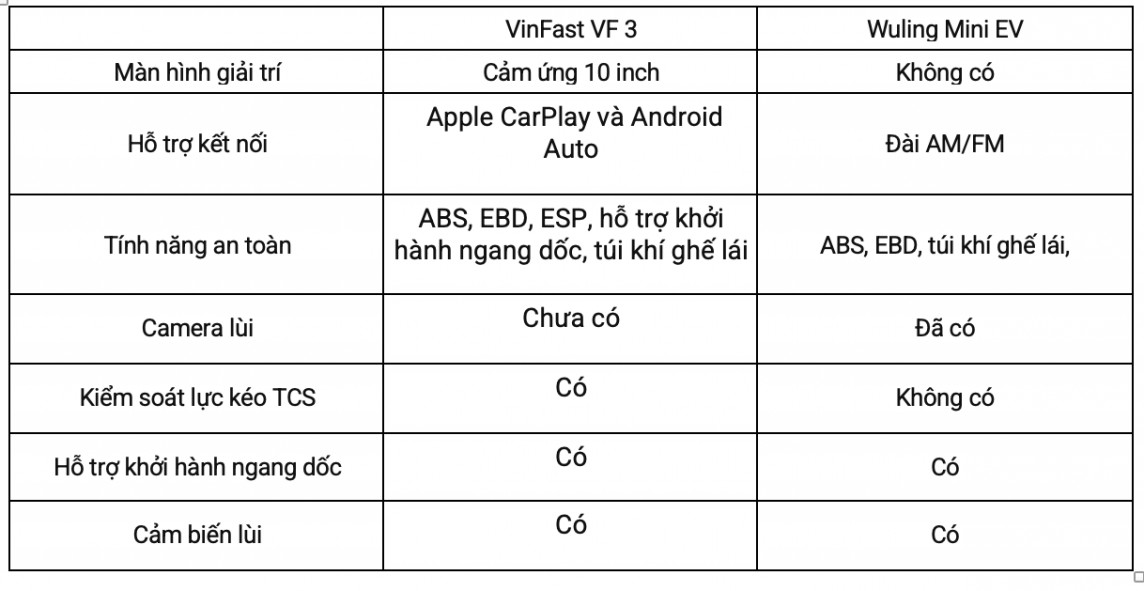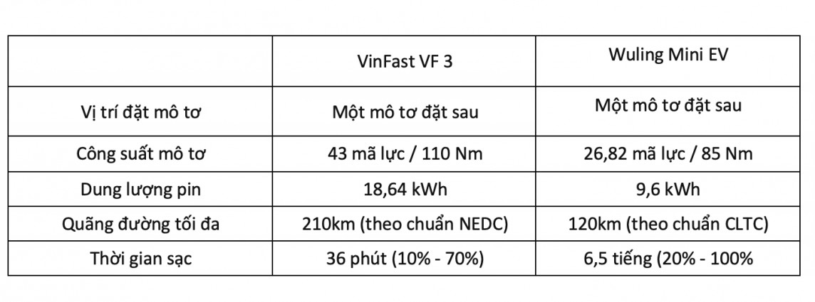 VinFast VF 3 tỏ ra vượt trội hơn nhiều so với Wuling Mini EV ở ba yếu tố bao gồm công suất, quãng đường di chuyển và tốc độ sạc. Đây đều là những yếu tố quan trọng ảnh hưởng đến trải nghiệm thực tế của người dùng, góp phần giúp VF 3 trở thành lựa chọn hợp lý hơn trong việc đáp ứng nhu cầu sử dụng hàng ngày.