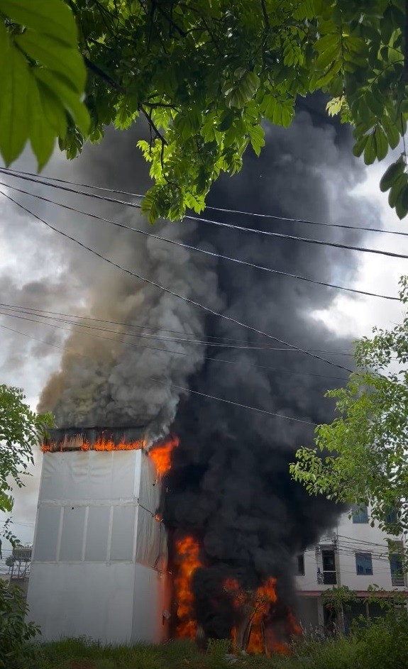 Ban đầu, đám cháy chỉ là một đốm lửa nhỏ, nhưng xuất hiện cột khói đen bốc cao hàng chục. Chỉ ít phút sau, ngọn lửa bốc lên dữ dội bao trùm toàn bộ ngôi nhà tạm kèm theo tiếng nổ lụp bụp.