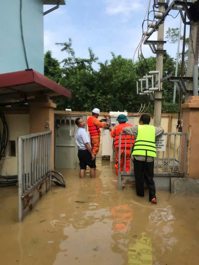 Cán bộ Điện lực Vĩnh Phúc khắc phục sự cố điện tại Trạm nước thô Nhà máy nước Việt Xuân. (Ảnh: Thu Thủy)