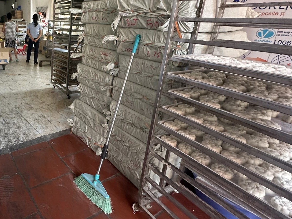 Tuy nhiên, theo quan sát của phóng viên Báo Công Thương, cơ sở trên chưa có khu sản xuất riêng biệt, có dấu hiệu không đảm bảo an toàn thực phẩm trong sản xuất kinh doanh và quy trình chế biến không đảm bảo an toàn; khu xưởng sản xuất chật hẹp, sắp xếp nguyên liệu lộn xộn, không có biện pháp che chắn, phòng chống côn trùng, sản phẩm sơ chế đặt nơi mất vệ sinh. Nhiều lao động tại đây hầu hết không được trang bị đầy đủ về bảo hộ lao động; khu vực chế biến mất vệ sinh... Đáng chú ý, trong khu sơ chế, cửa ra vào vương đầy bột bánh…