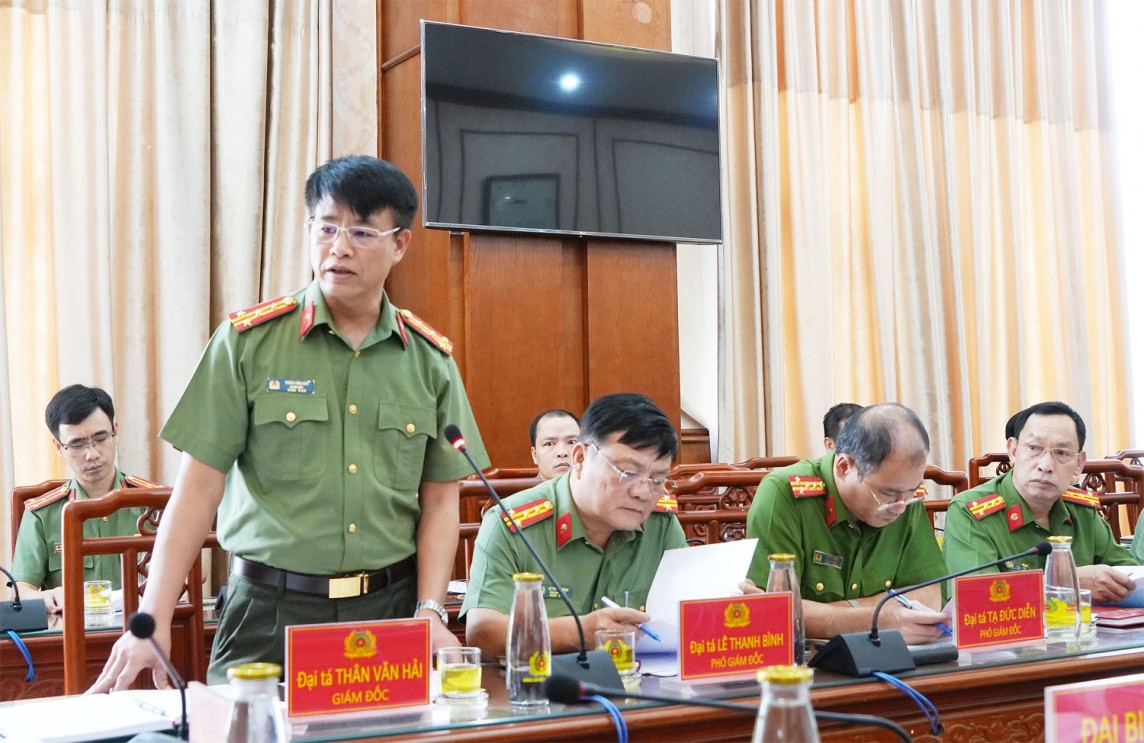 | Giám đốc Công an tỉnh Thân Văn Hải báo cáo tình hình, kết quả công tác bảo đảm an ninh trật tự 8 tháng đầu năm 2024 (Ảnh: Dương Hà) |