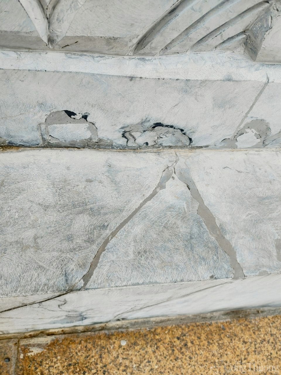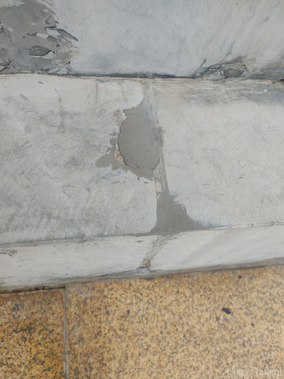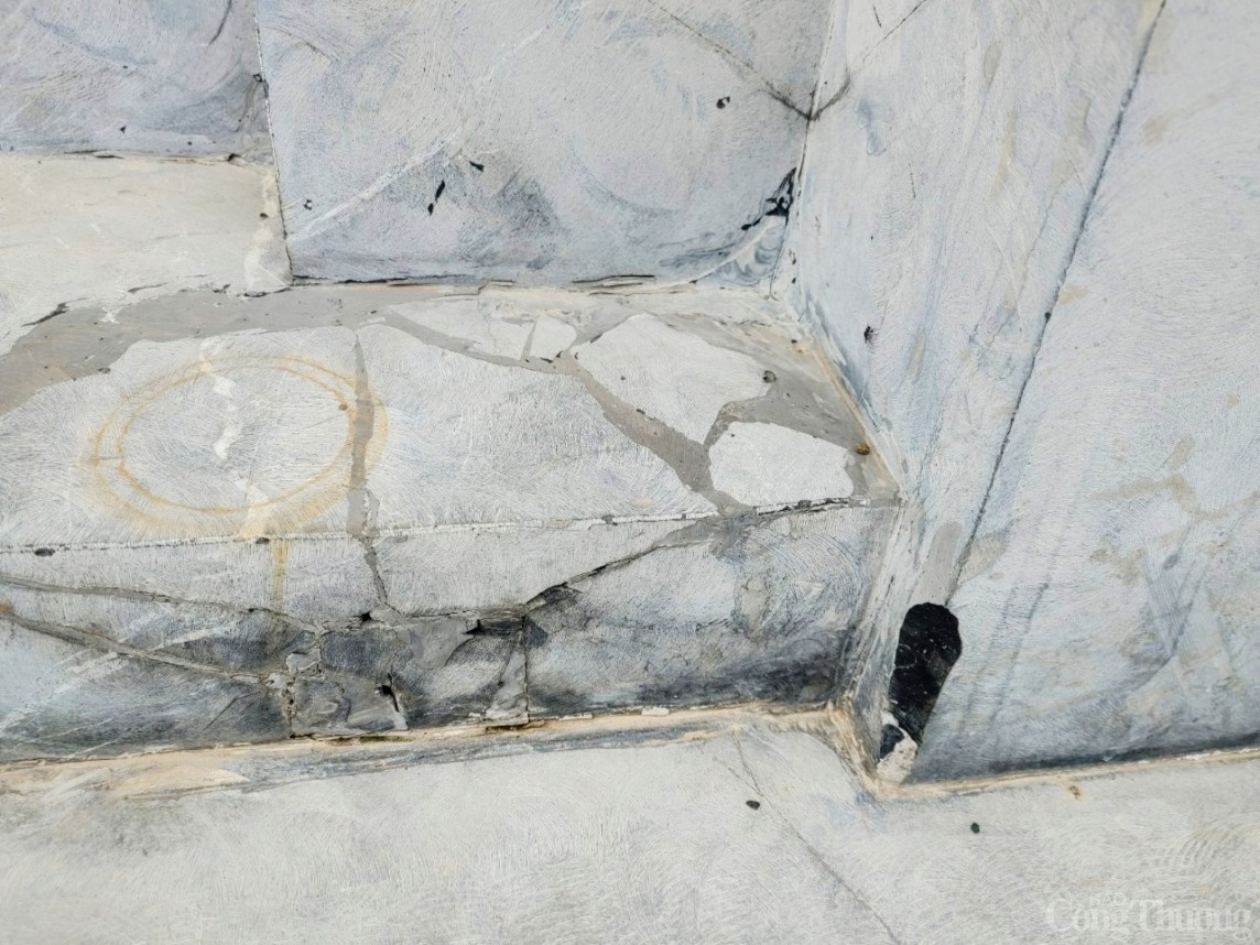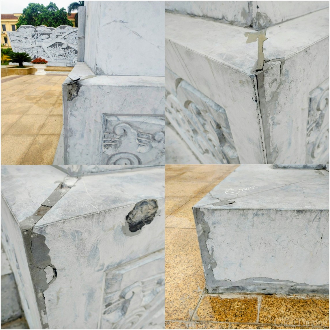 | Ở chân tượng đài, rất nhiều lỗ hổng và vết mẻ cạnh phải “ngụy trang” bằng cách chát vữa xi măng |