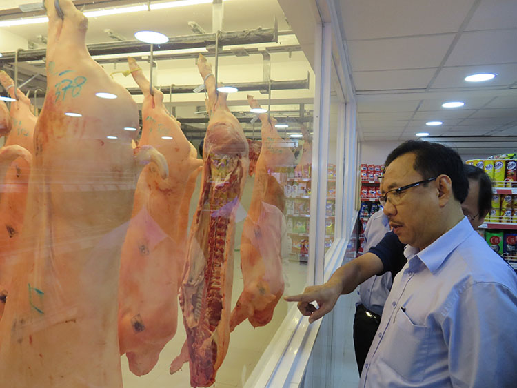 Theo đó, thịt heo sau khi giết mổ và pha lóc sẽ vận chuyển treo trên xe bảo ôn chuyên dụng, bảo đảm an toàn vệ sinh thực phẩm khi đưa đến hệ thống phân phối. Tại điểm bán, công ty trang bị tủ mát để bảo đảm chất lượng thịt, đồng thời, tất cả nhân viên quầy hàng thịt tươi sống đều được trang bị các dụng cụ chuyên dụng và kiến thức về an toàn thực phẩm. Giá bán thịt loại đặc biệt, loại 1, loại 2, loại 3 tại của hàng là: Heo mảnh 41.000 đ/kg, 40.000 đ/kg, 39.000đ/kg, 37.000 đ/kg; đùi heo khúc 41.000đ/kg, 40.000 đ/kg 39.000 đ/kg, 37.000 đ/kg; vai heo khúc 40.000 đ/kg, 39.000 đ/kg, 38.000 đ/kg, 36.000 đ/kg; ba rọi 42.000 đ/kg, 41.000 đ/kg, 40.000 đ/kg, 38.000 đ/kg.