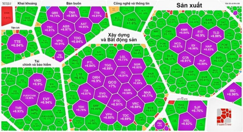 | Hàng loạt cổ phiếu phủ đầy màu xanh tím |