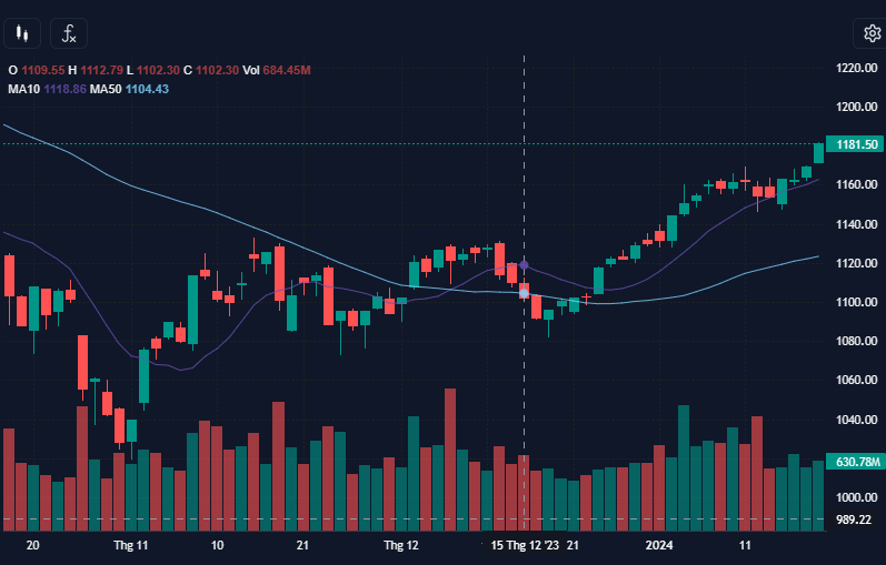 | Cổ phiếu ngân hàng trở lại vai trò chủ lực trên thị trường giúp Vn-Index tăng 12,44 điểm |