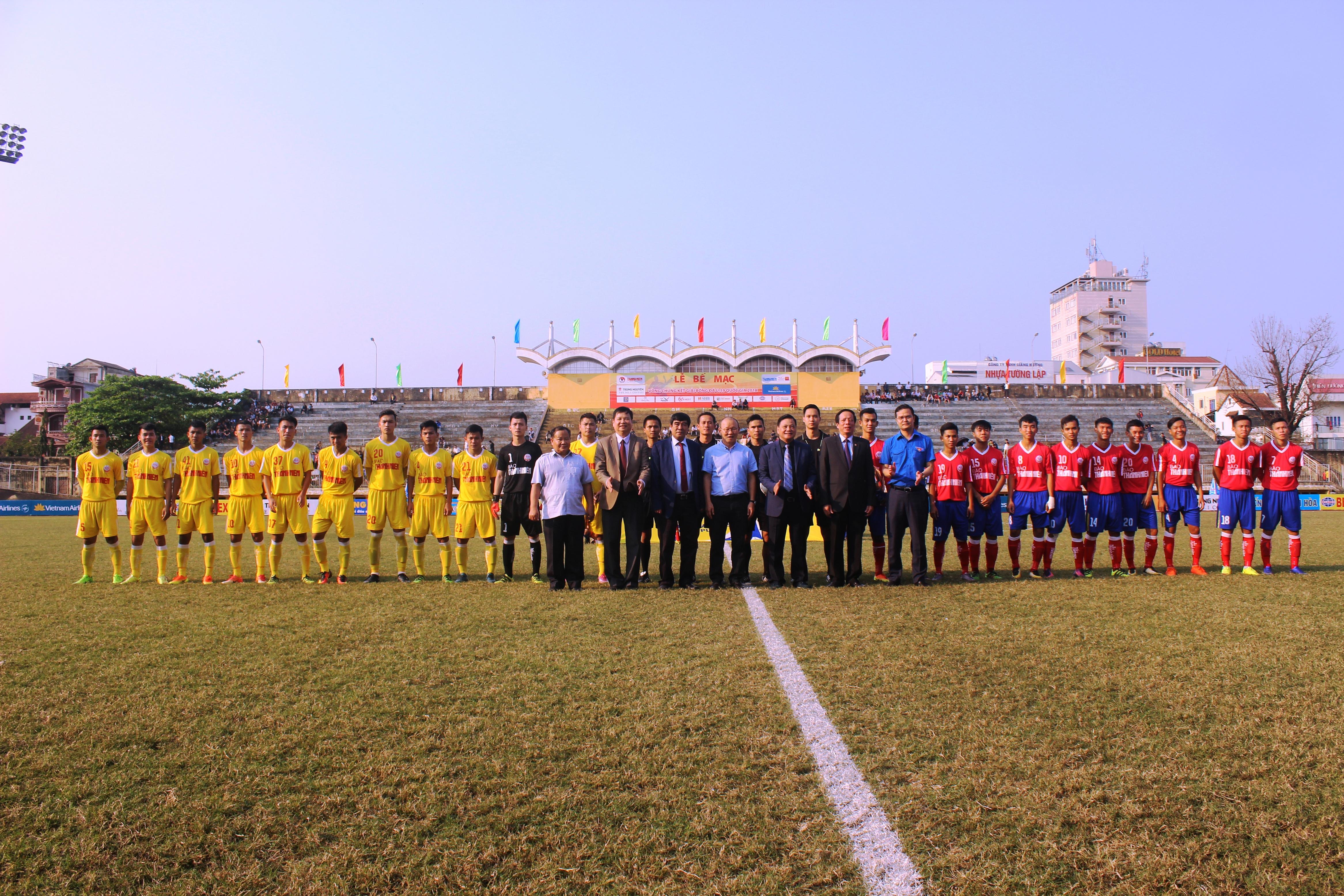 | HLV trưởng đội tuyển Việt Nam Park Hang Seo cùng đại diện VFF và lãnh đạo tỉnh Thừa Thiên Huế động viên hai đội trước khi thi đấu |