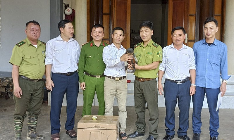Gia đình ông Nguyễn Xuân Nin bàn giao cá thể chà vá chân nâu cho đại diện Vườn Quốc gia Vũ Quang. |